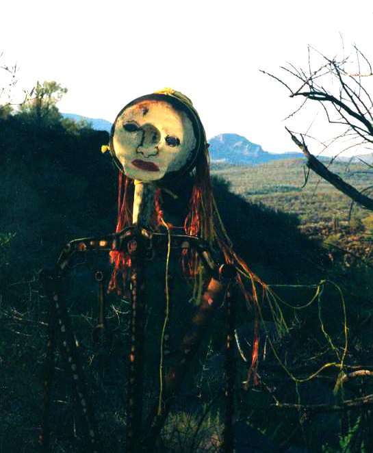 George not only mastered the use of traditional canvas and oil paint, but he also created art from objects others might consider junk. On his daily walks through the desert with his trusty dogs, he would find treasures that he would incorperate into his sculpturs and and paintings.